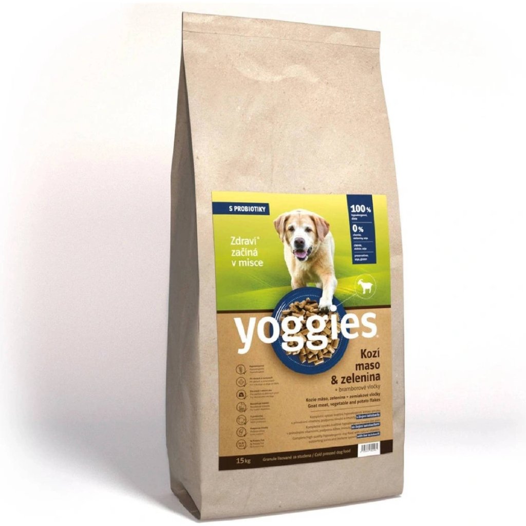 20kg Yoggies Kozí maso&zelenina, hypoalergenní granule lisované za studena s probiotiky
